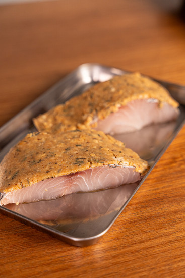 Com ajuda de um plástico e um rolo, abrir esta mistura em um retângulo de aproximadamente 2mm de espessura, com tamanho suficiente para cobrir a pele do peixe.